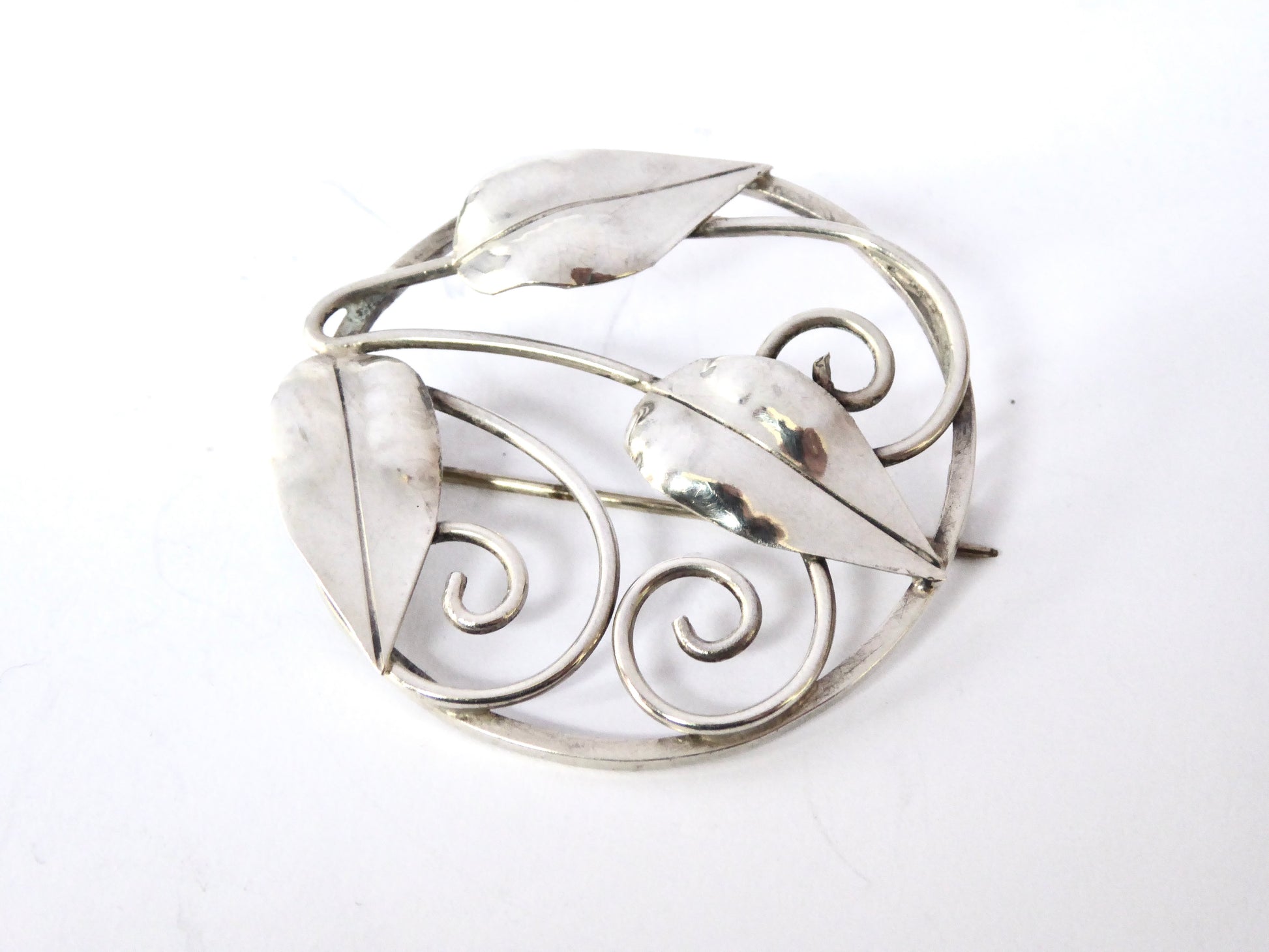 Antique Circular Silver Brooch - Leaf and Scroll design