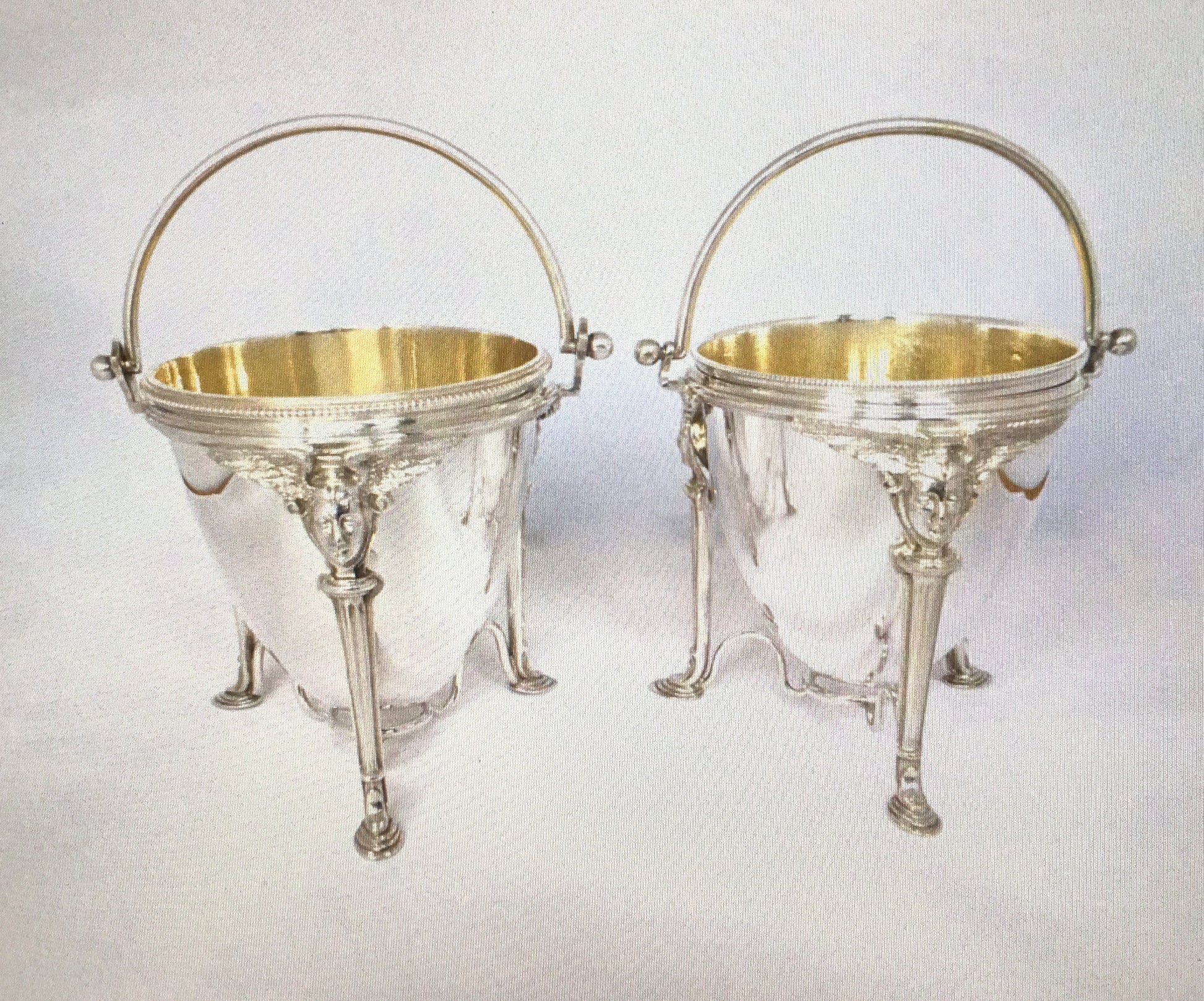 Unusual pair of 19th. Century circular Sugar and Cream baskets on Hoof feet. Silver plated.
