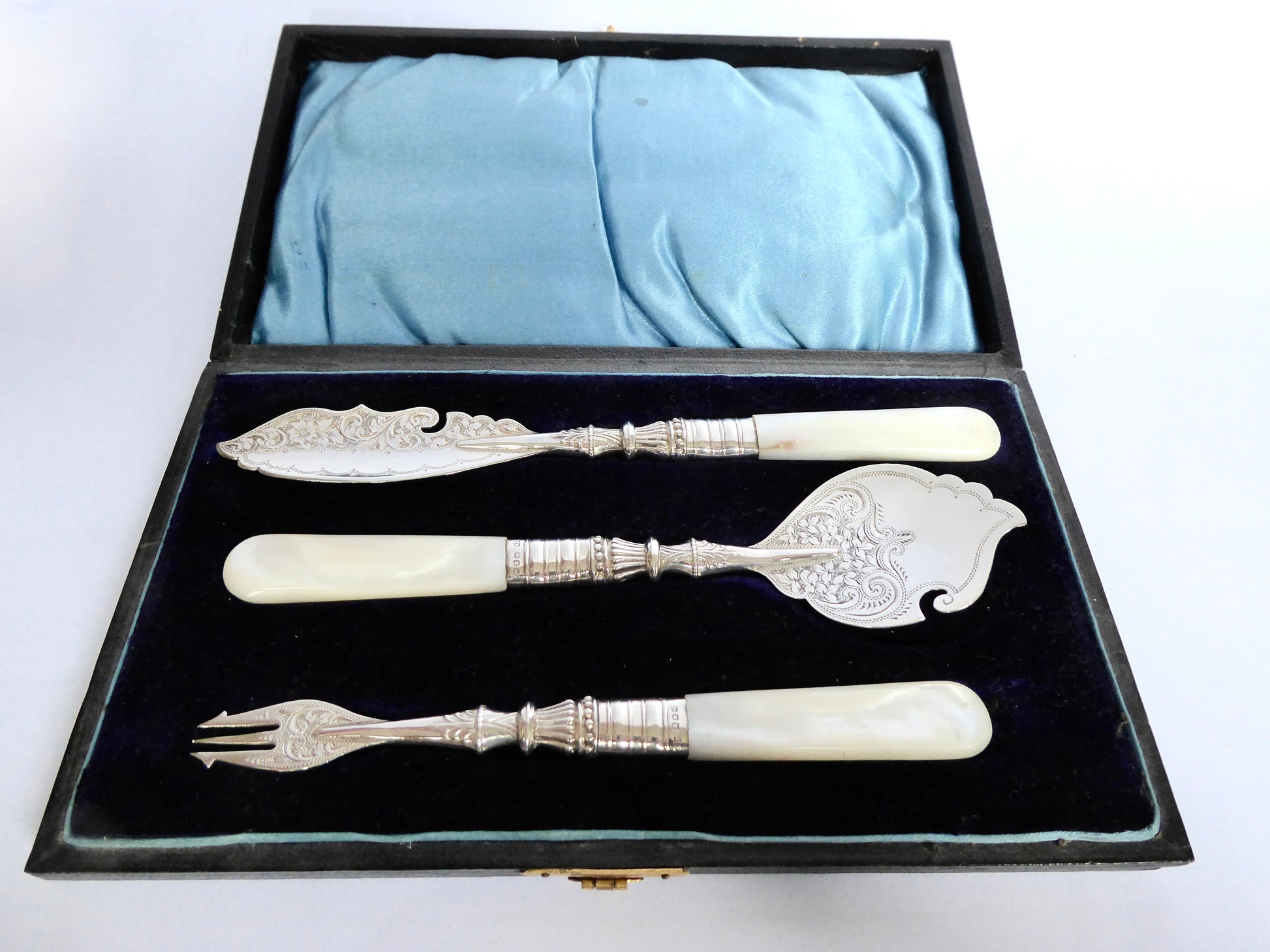 Unusual Silver and Mother of Pearl Butter Knife, Jam Spoon, & Fork in original fitted case