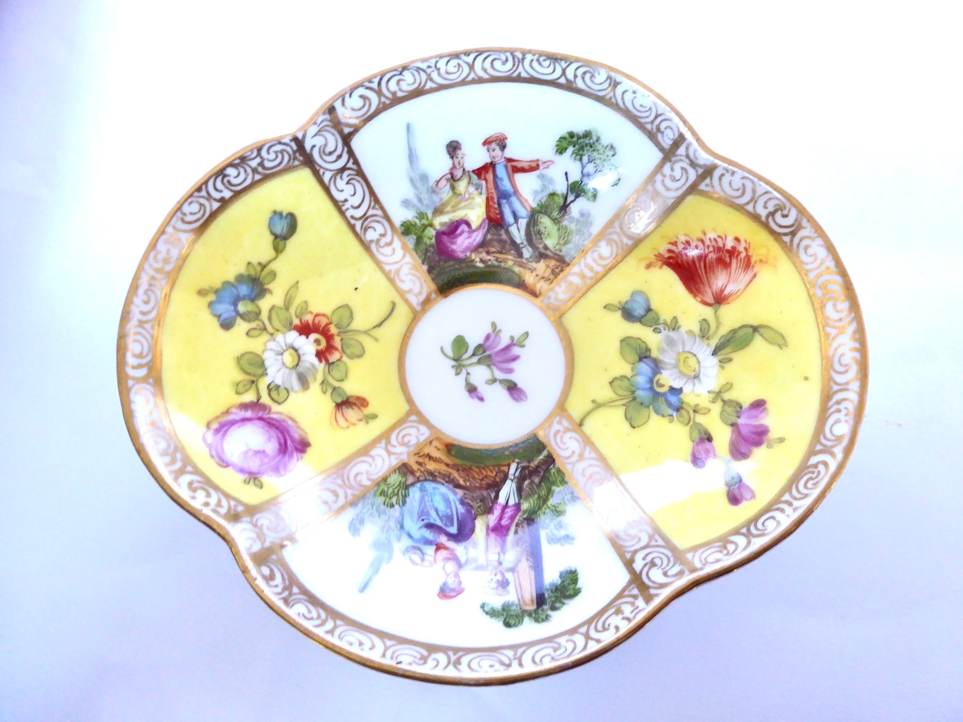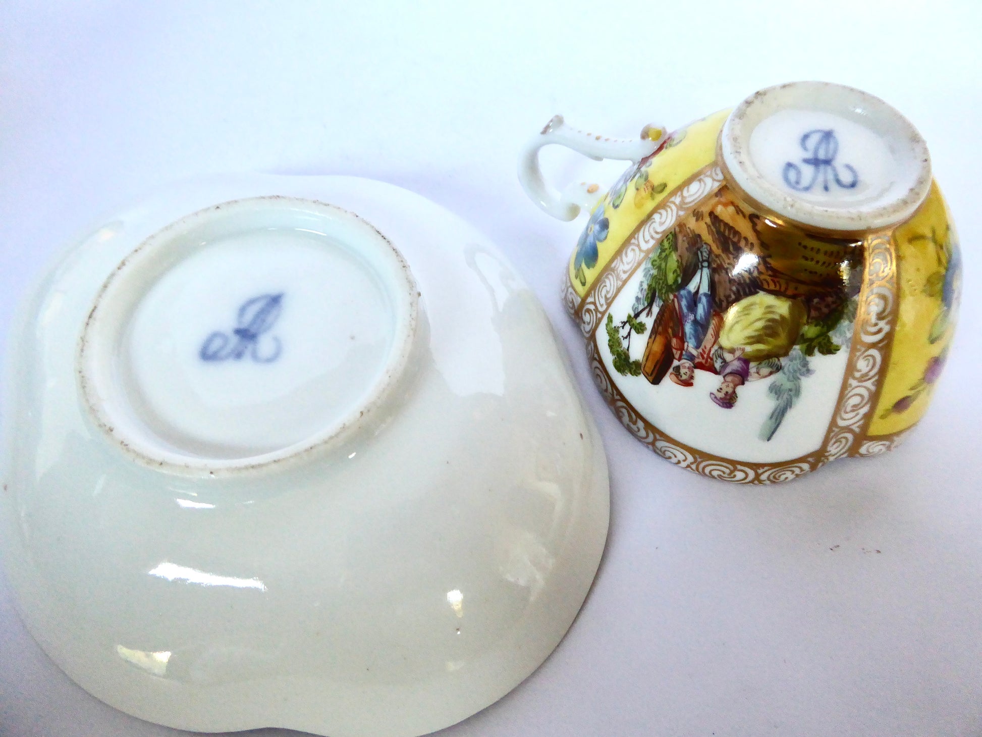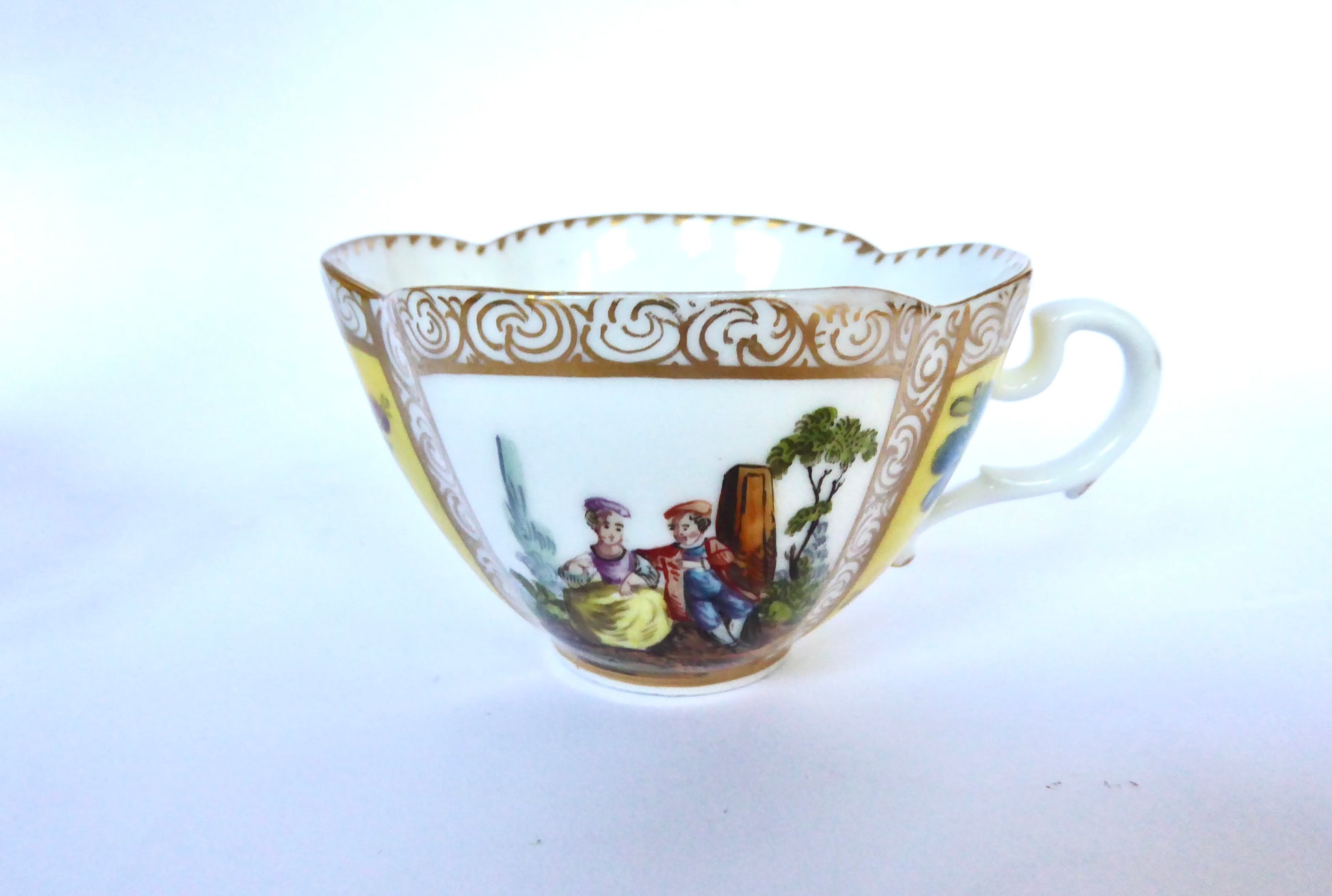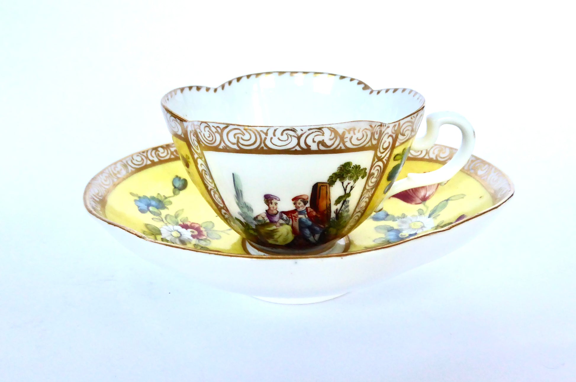 Antique Dresden Cup & saucer- Yellow Ground & Lovers scene
