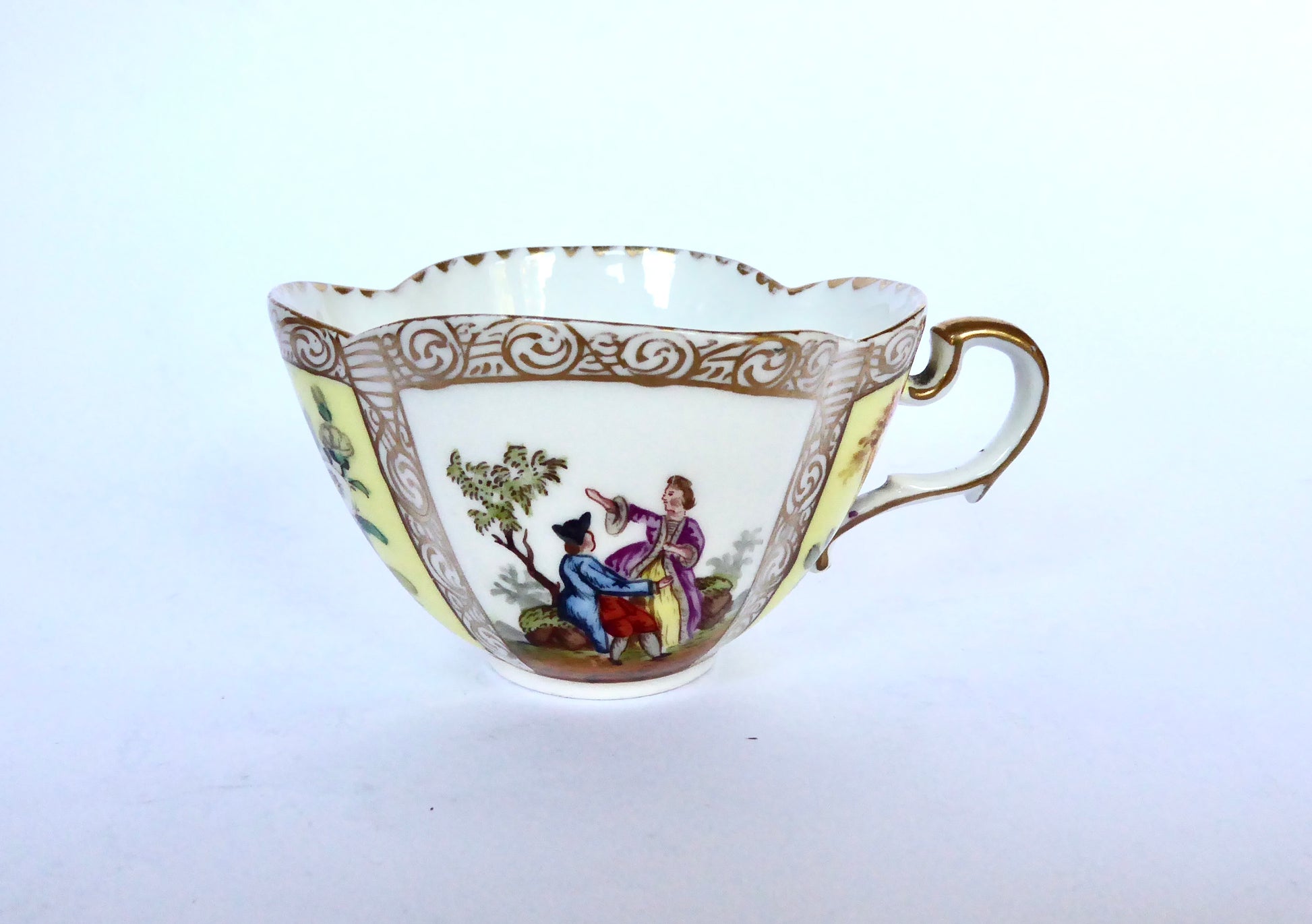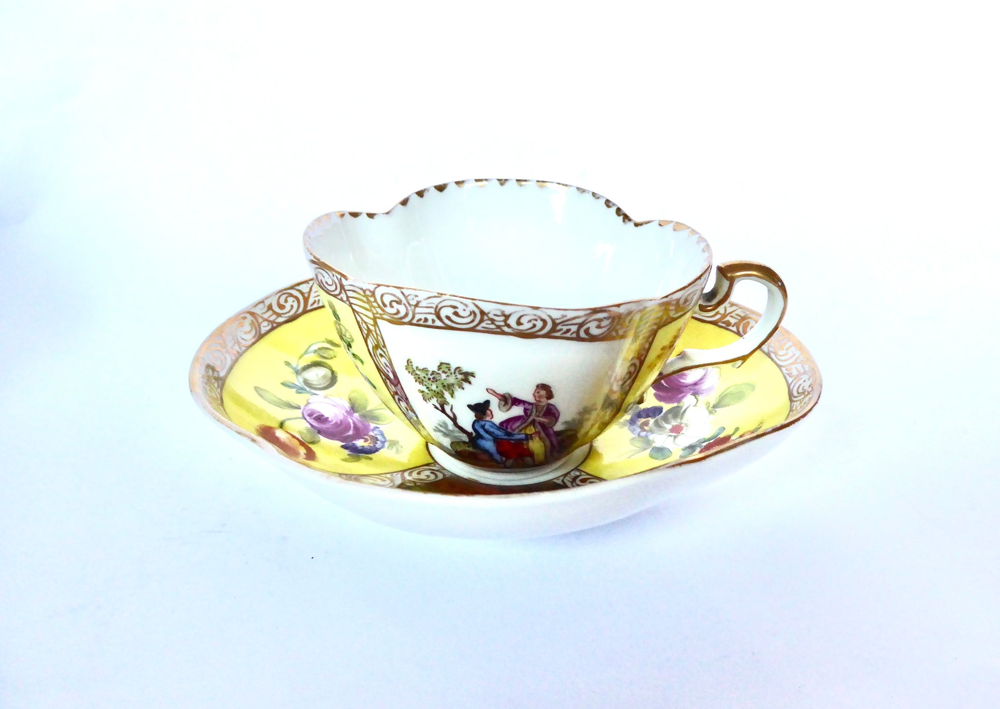 Antique Dresden Quatrefoil Cup & Saucer. Yellow ground & Lovers scenes