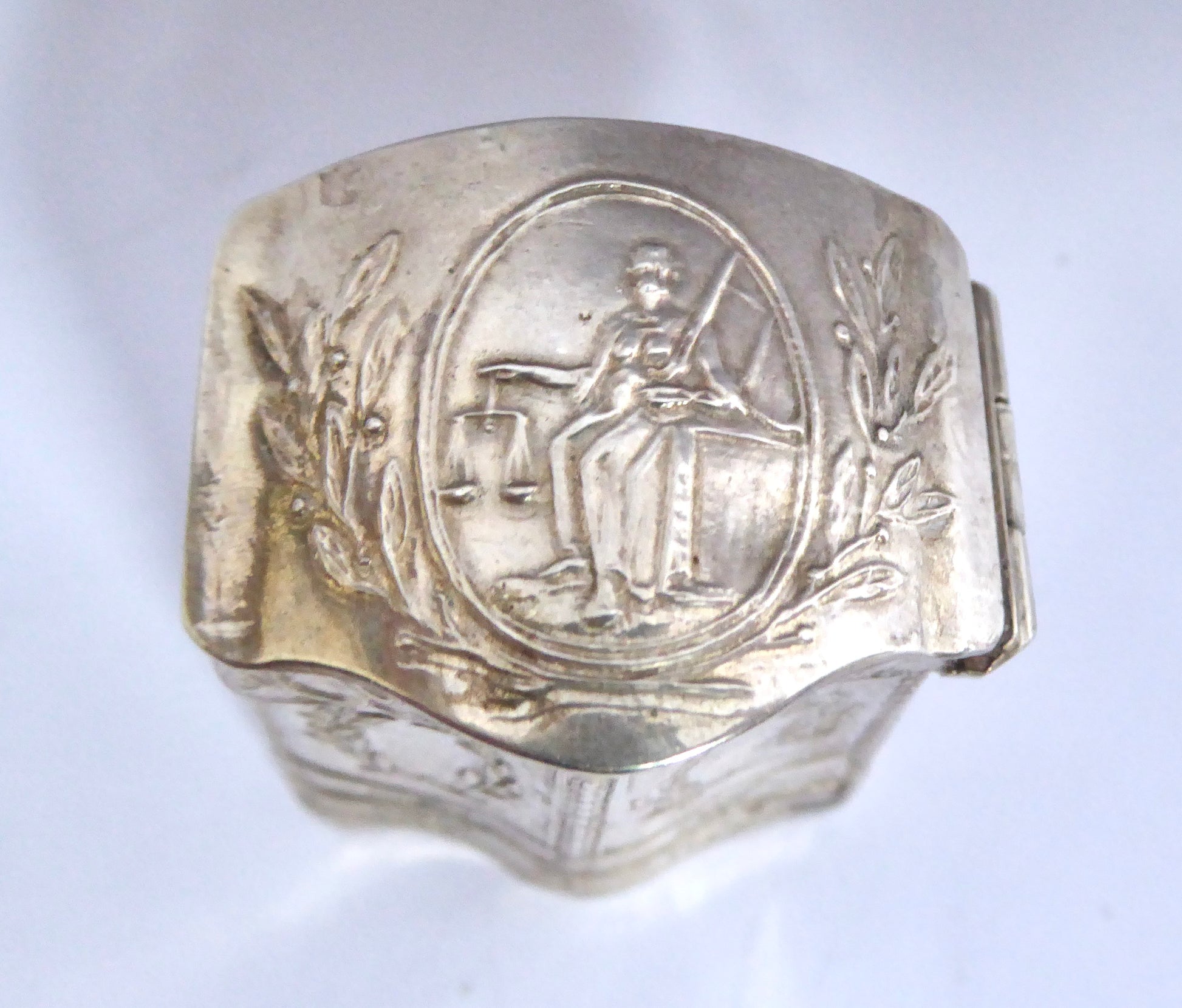 Antique Silver Scent Box in the shape of a Cabinet.The lid is embossed with figure ofLady Justice holding Scales.