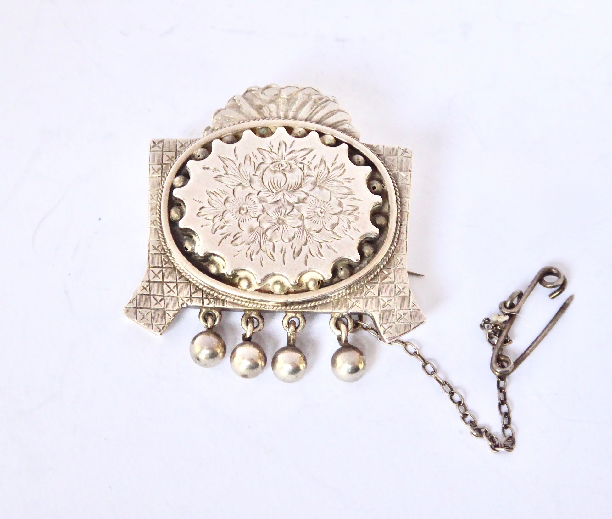 Engraved ornate Victorian Silver Brooch with a locket on the reverse. Safety Chain