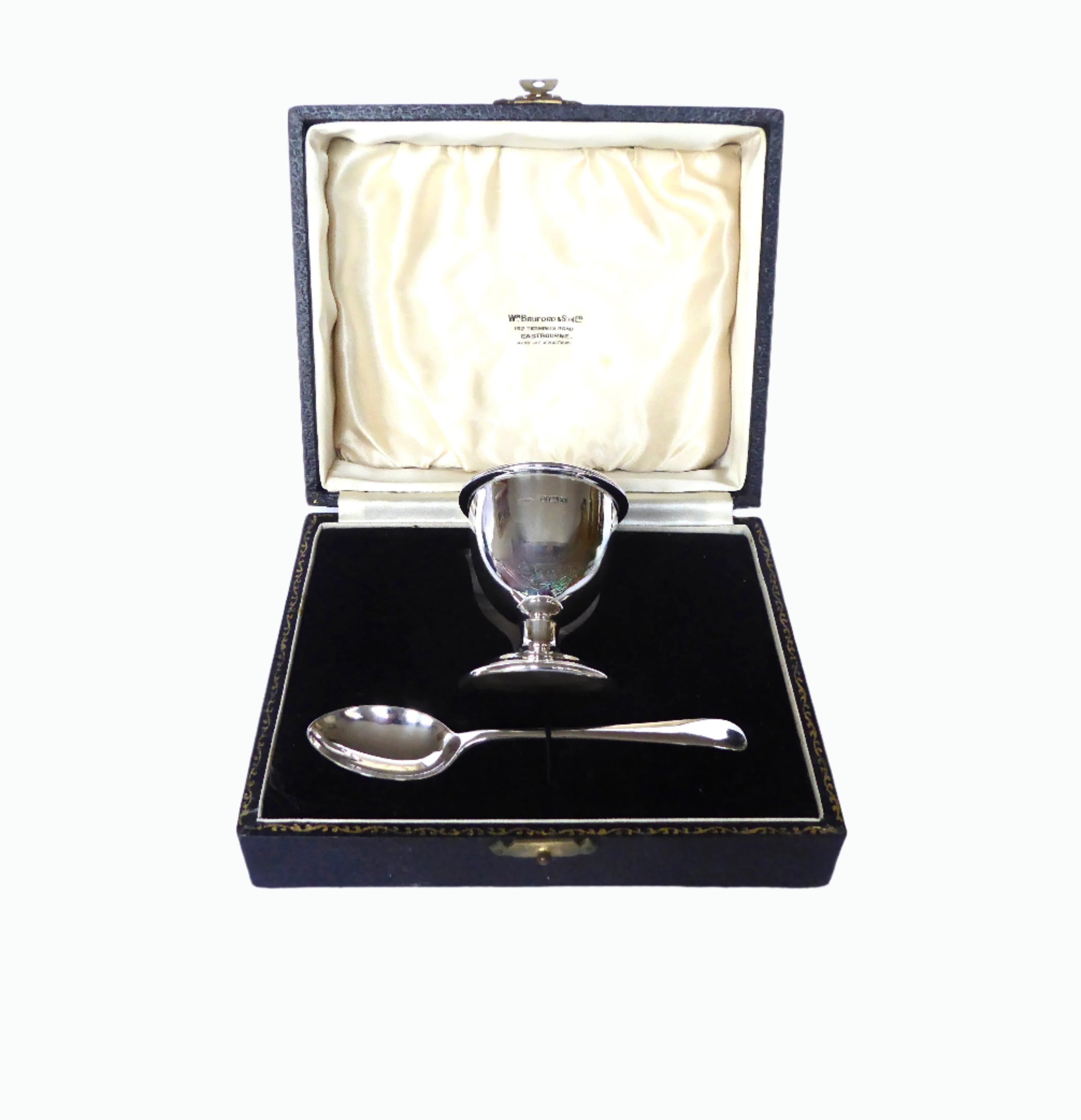 Vintage plain Silver Egg Cup & Spoon in original fitted box