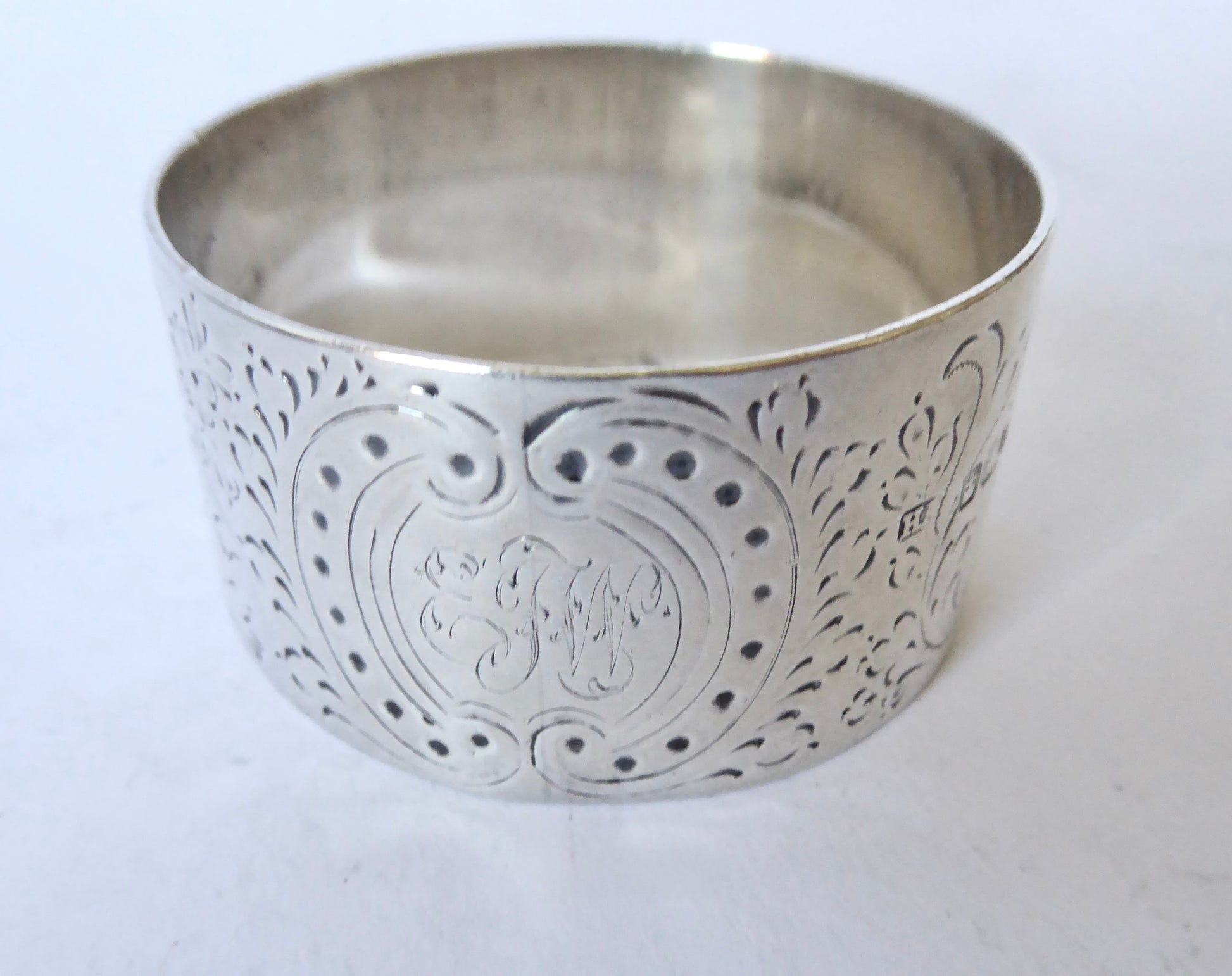 Antique Silver scroll Design napkin Ring. Engraved with initials