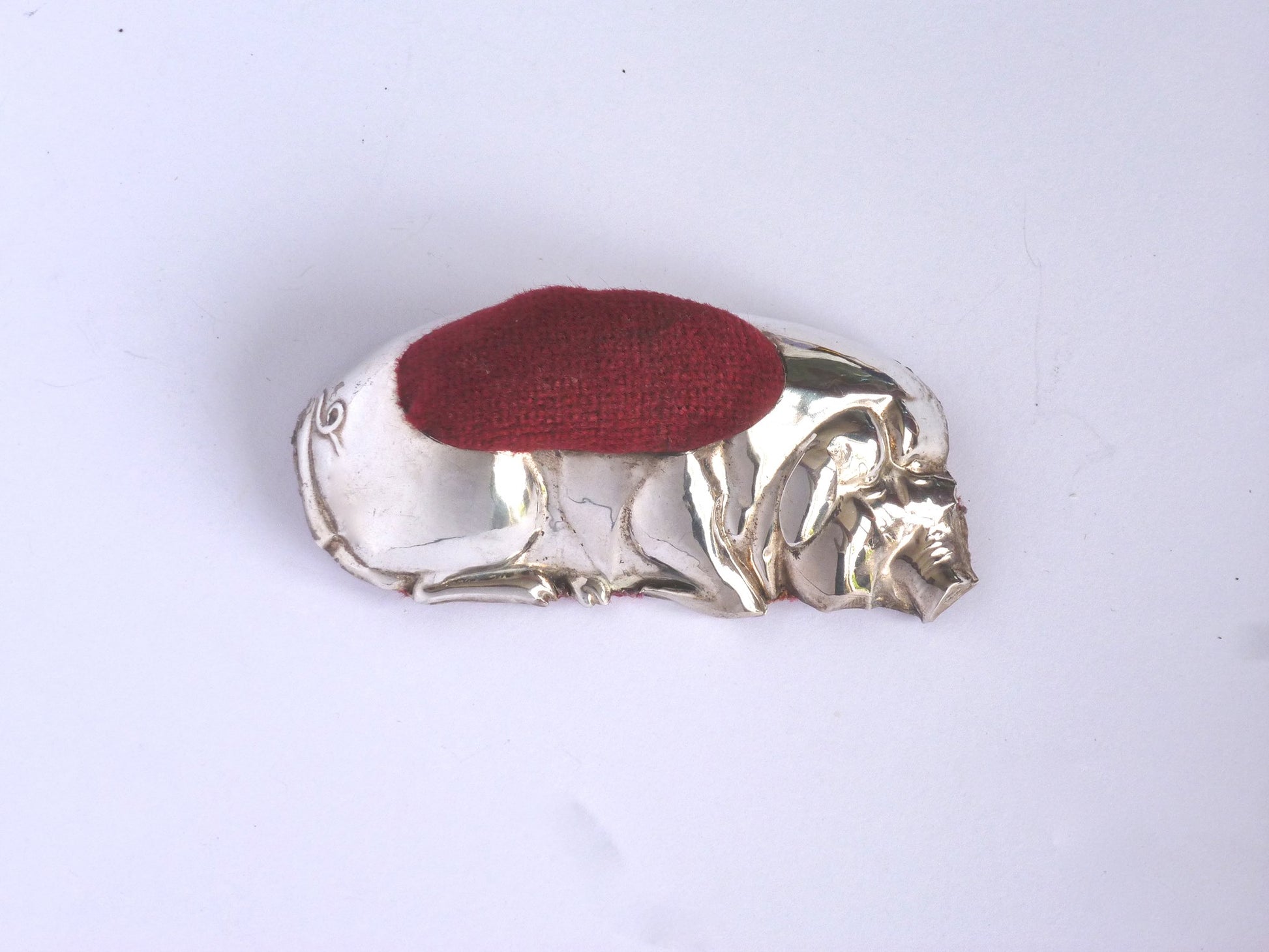 Novelty Silver Pin Cushion in the shape of a Pig.