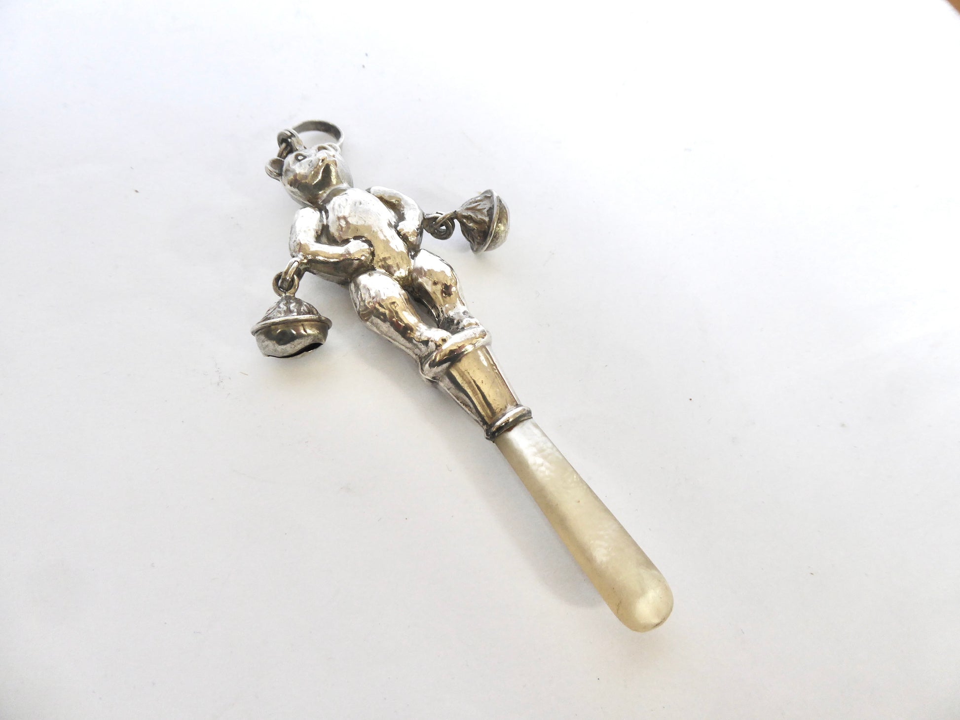 Rare Silver and Mother of Pearl Teddy Bear Baby Rattle with two Silver Bells