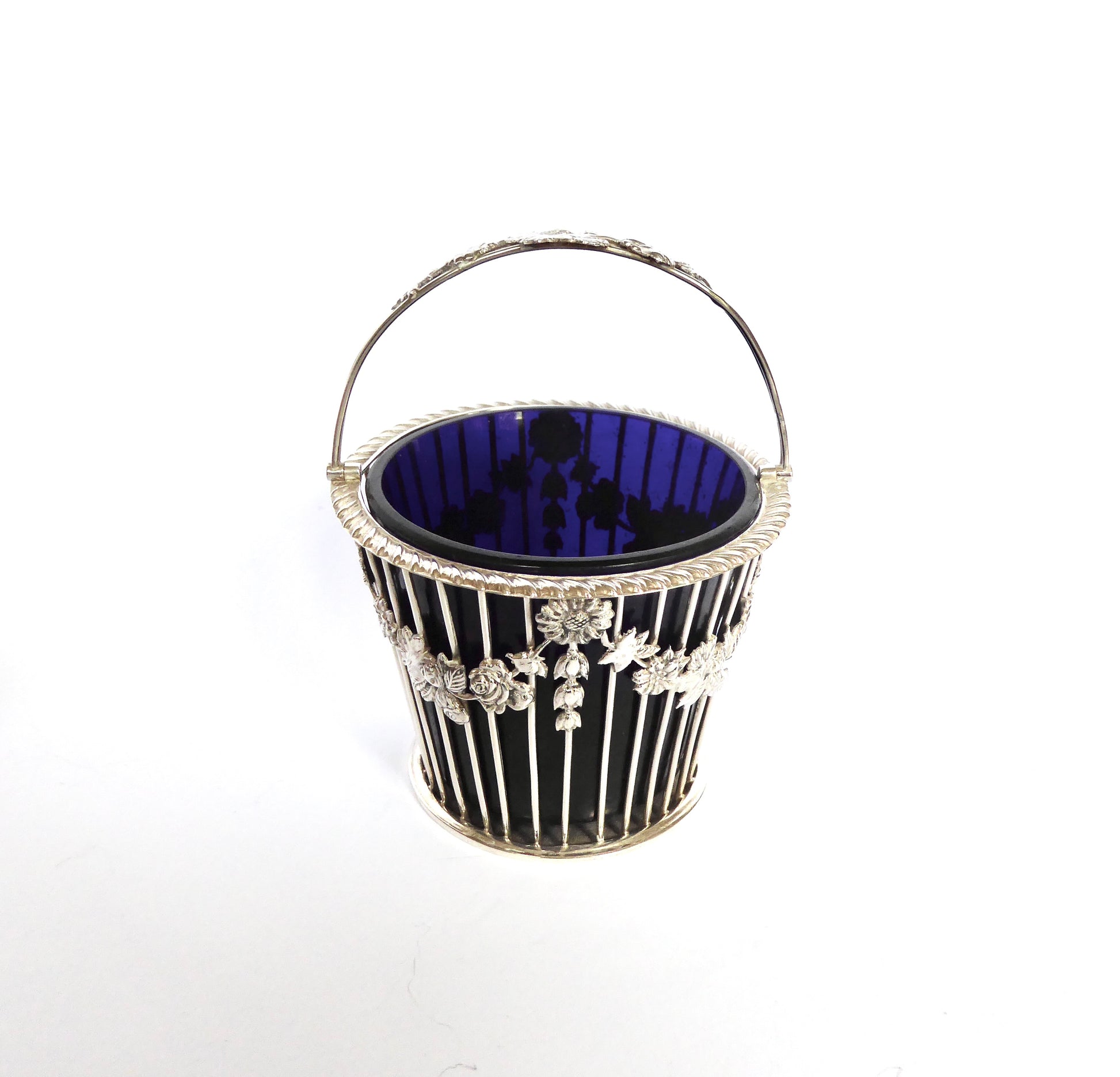 Floral design Silver Wirework Basket with Blue Glass Liner